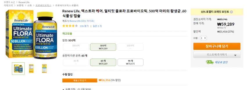 유산균 가성비제품중에선 상당히 유명한 제품입니다. 50억 함량이 조금 아쉽다 싶으신분들은 균수가 더많은제품도 있으니참고하시기 바랍니다.