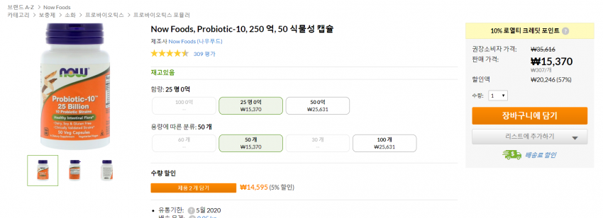 나우푸드사의 유산균입니다. 한알 300원꼴로 상당히 저렴하고 균수도 괜찮습니다.